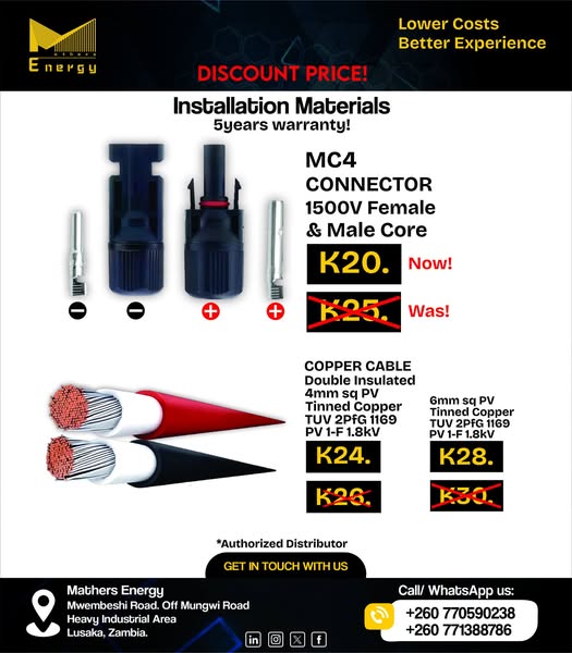 #mathersenergy #solarinstallation #DiscountDeals #solarzambia #OffGridSolutions #lowercost #betterexperience #solarclamps #coppercables #mc4connectors #ZambiaBusiness