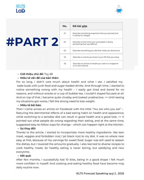 搜索关键词 IELTS Speaking preparation, IELTS Speaking forecast, Free IELTS material, IELTS Lab Hanoi, IELTS exam tips, IELTS Speaking Part 2, IELTS Vocabulary, Speaking Exam 2025, Prepare IELTS Exam优势 Free resource,Comprehensive coverage (3 parts),Up-to-date content (Q2/2025 forecast),Detailed guidance and vocabulary