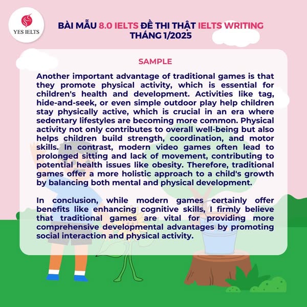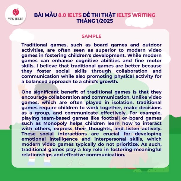 🤩 Nhiều người cho rằng trò chơi truyền thống tốt hơn các trò chơi hiện đại trong việc giúp trẻ phát triển, và đề tài thú vị ấy đã được đưa vào đề thi IELTS ngay chính trong tháng 1 vừa rồi.💫