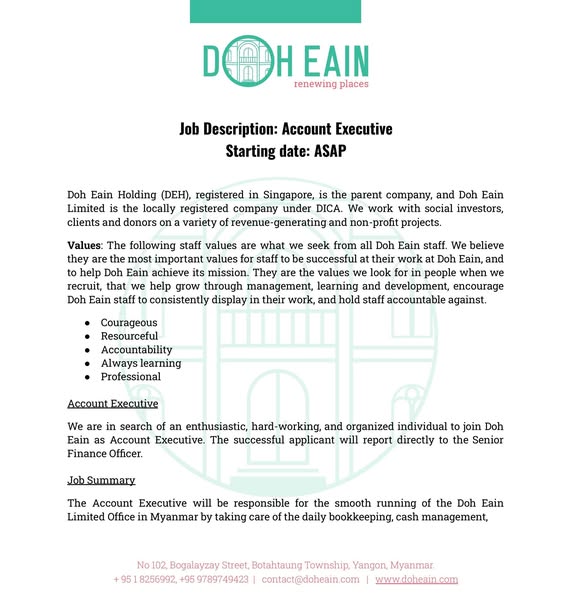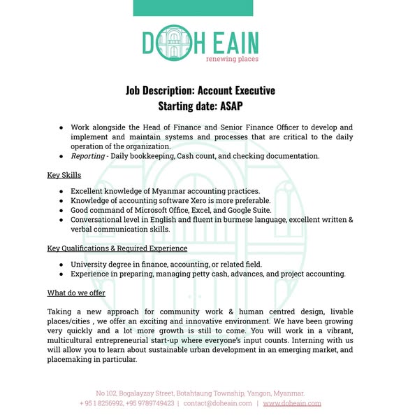 搜索关键词 Account Executive, Myanmar Accounting, Social Enterprise, Job Opportunity, Financial Reporting, career doheain, job posting, hiring now, resume apply, cover letter优势 Opportunity to work in a social enterprise,Key role in financial reporting,Growing team