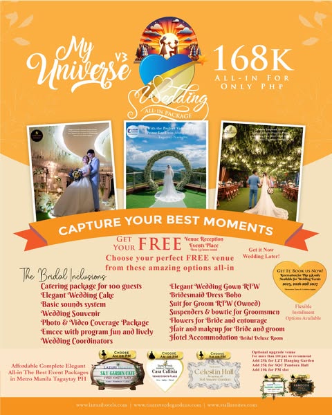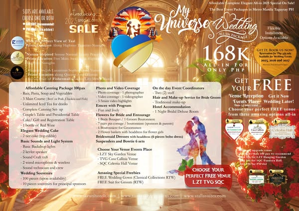 🌟 Don’t Miss the Wedding Deal of a Lifetime! 🌟 💍 Calling all soon-to-wed couples in Tagaytay and Quezon City, Metro Manila! Prepare to be amazed by our exclusive ""My Universe"" Affordable Wedding Package—now available for only PHP 168,000 ALL-IN! 💒 And guess what? It comes with a FREE venue of your choice! 🎁✨