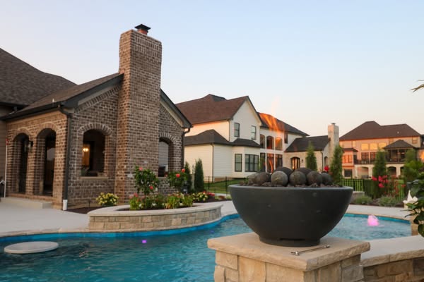 Bold fire feature, elegant stonework, and a crystal-clear pool—this backyard was built for beauty, comfort, and unforgettable evenings.