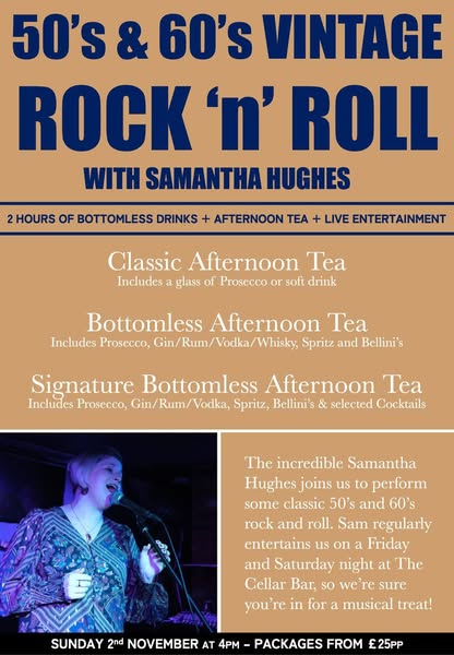 Afternoon Tea with Samantha Hughes - one of the best singers for this era, performing classic 50's/60's rock and roll.