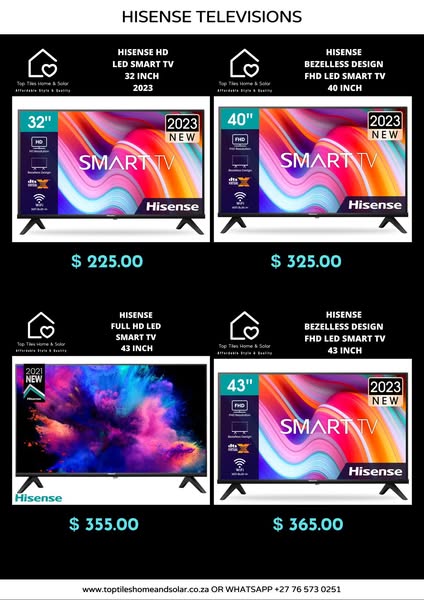 搜索关键词 Hisense Zimbabwe, Smart TVs, Home Appliances, Harare Zimbabwe, Appliance Sale, TV Sale, Kitchen Appliances, Refrigerator Sale, Washing Machine, Tumble Dryer优势 Wide range of products (TVs, Sound systems, Kitchen Appliances, Laundry Appliances, Refrigerators),Door delivery included in price within Zimbabwe,Multiple payment options (USD, RAND, VISA/Mastercard)
