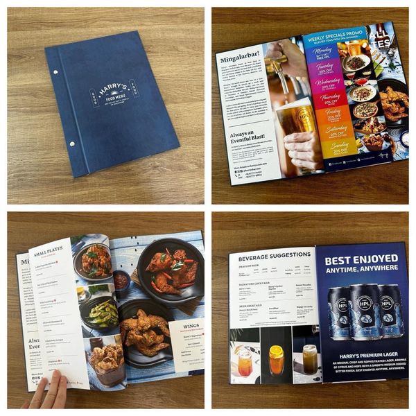 搜索关键词 menu printing, restaurant menu, cafe menu, digital printing services, custom menu design, myanmar printing, food menu design, professional menu, menu service, gs printing优势 High-quality digital press printing,Variety of paper and cover options (Artcard, Matte, Kraft, Leather, Canvas),Customizable designs and formats,Fast turnaround time,Nationwide service with cargo shipping