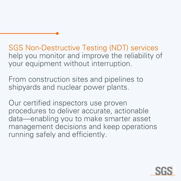 💡SGS Non-Destructive Testing (NDT) services help identify hidden defects—without interrupting your operations. From pipelines to power plants, our certified inspectors use advanced techniques to ensure asset integrity and operational efficiency.