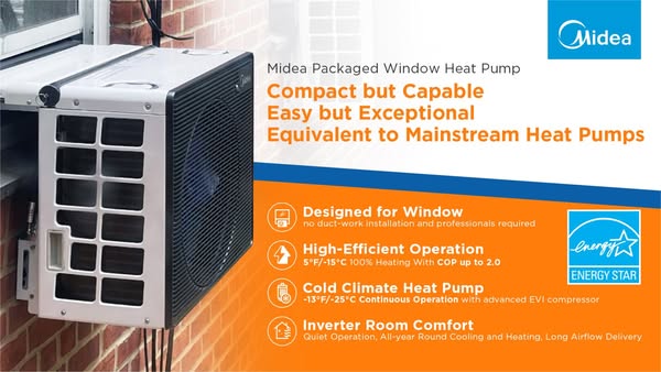 搜索关键词 window heat pump, apartment heating, condo cooling, high rise comfort, easy install HVAC, energy efficient heating, silent heat pump, cold weather heating, Midea heat pump, renter friendly heating优势 Easy installation (no ductwork, no pros),Designed for multi-family living (apartments, condos, high-rises),Extreme cold weather performance,Silent operation,Energy efficient (COP 2.0),Year-round comfort (cooling and heating)