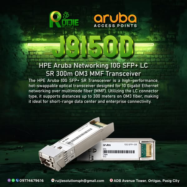 The HPE Aruba 10G SFP+ SR Transceiver is a high-performance, hot-swappable optical transceiver designed for 10 Gigabit Ethernet networking over multimode fiber (MMF).