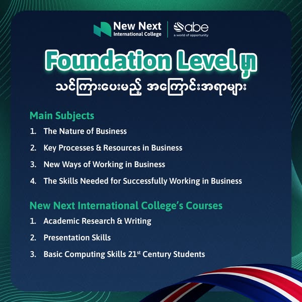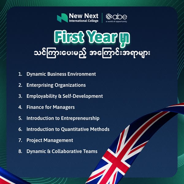 👉ဒါကြောင့် UK ဘွဲ့ကို ပြည်တွင်းကနေ ကုန်ကျစရိတ်သက်သက်သာသာနဲ့ ရယူချင်တဲ့လူငယ်တွေအတွက် New Next International College ကနေ "BA (Hons) Business Administration" (ABE Pathway) တန်းခွဲသစ်တွေကို January လထဲမှာ ပြန်လည်ဖွင့်လှစ်တော့မှာ ဖြစ်ပါတယ်။