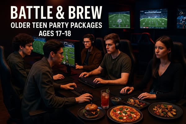 Create unforgettable memories at Battle & Brew, where gaming meets celebration! Our customizable party packages cater to gamers of all skill levels and interests. Choose from our library of popular titles including Fortnite, Mario Kart, FIFA, Marvel Rivals, and more across multiple platforms. With delicious food, specialty drinks, and a vibrant gaming atmosphere, we handle everything so you can focus on what matters—having an epic time with friends. Whether it's a birthday, special occasion, or just because, level up your celebration at Battle & Brew!