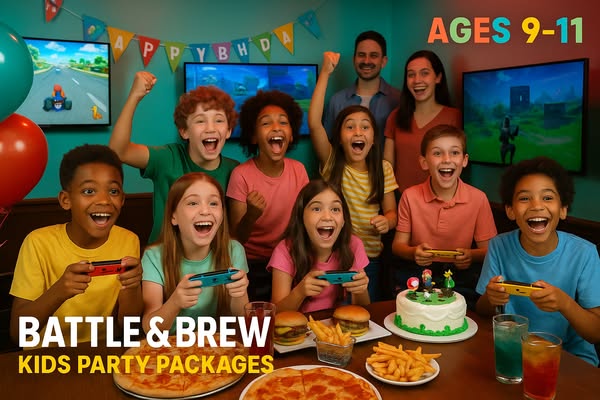 Create unforgettable memories at Battle & Brew, where gaming meets celebration! Our customizable party packages cater to gamers of all skill levels and interests. Choose from our library of popular titles including Fortnite, Mario Kart, FIFA, Marvel Rivals, and more across multiple platforms. With delicious food, specialty drinks, and a vibrant gaming atmosphere, we handle everything so you can focus on what matters—having an epic time with friends. Whether it's a birthday, special occasion, or just because, level up your celebration at Battle & Brew!
