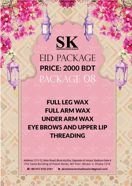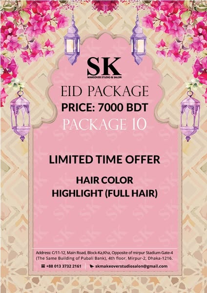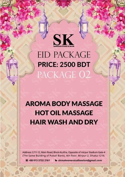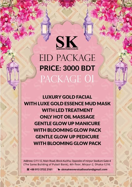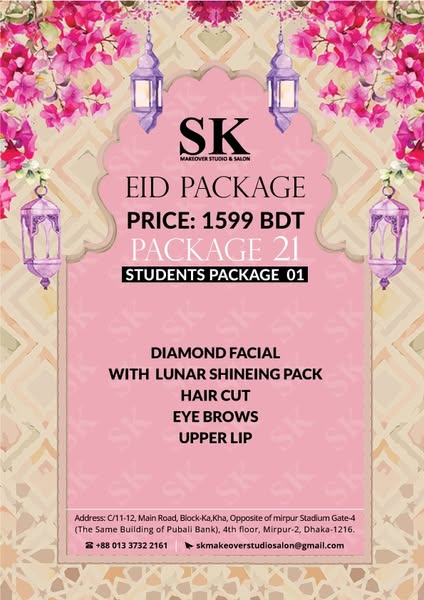 搜索关键词 Eid salon offer, salon 50 percent off, haircuts and styling, manicures and pedicures, facials skincare, Mirpur salon, Sk Makeover salon, luxury salon services, salon discount, relaxing massages优势 50% discount on all services,Wide range of salon services offered,Luxurious salon experience