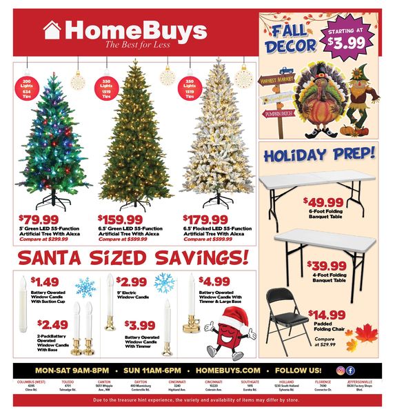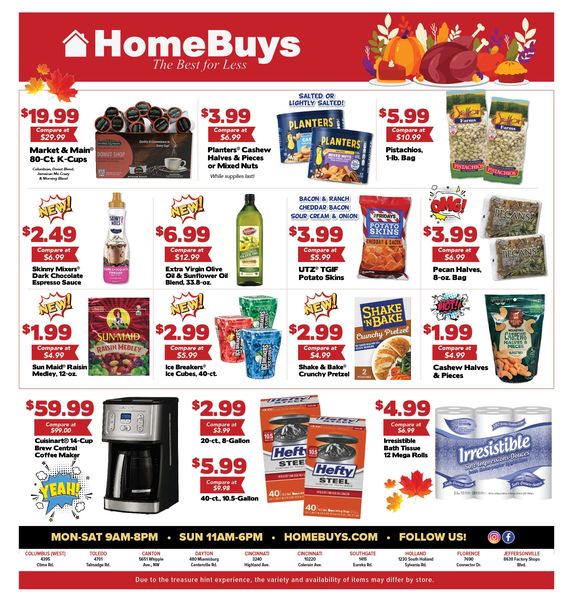搜索关键词 HomeBuys deals, Fall decor discounts, Thanksgiving decorations, Holiday home savings, Discount home goods, Affordable decorations, Home decor sales, Seasonal discounts, Folding table sale, Kitchenware deals优势 25% off Fall Decor,$20 off purchases over $100,Competitive Pricing (Compared at),Wide variety of home goods and holiday decorations,Multiple store locations