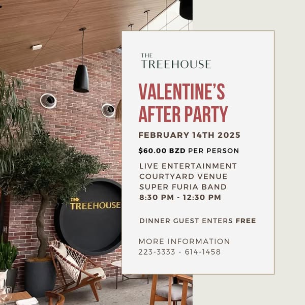 搜索关键词 valentine's day dinner, romantic dinner, belize restaurant, treehouse restaurant, live music, special event, couple date night, romantic date, restaurant promotion, anniversary event优势 Romantic 5-course dinner,Live entertainment by Super Furia Band,Elegant atmosphere at The Treehouse,Free entry to after party for dinner guests