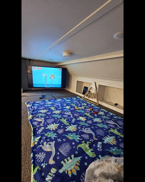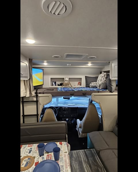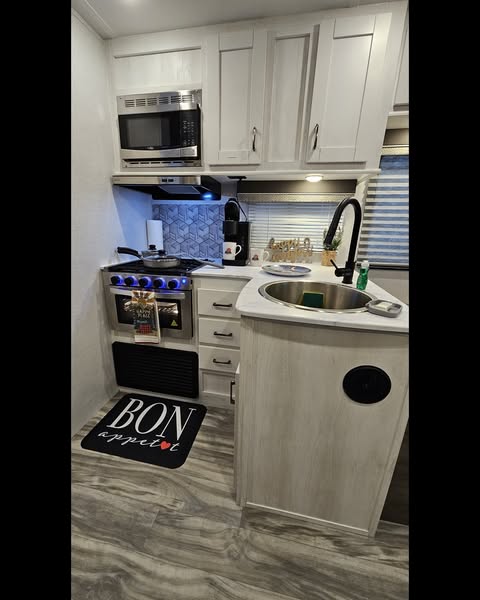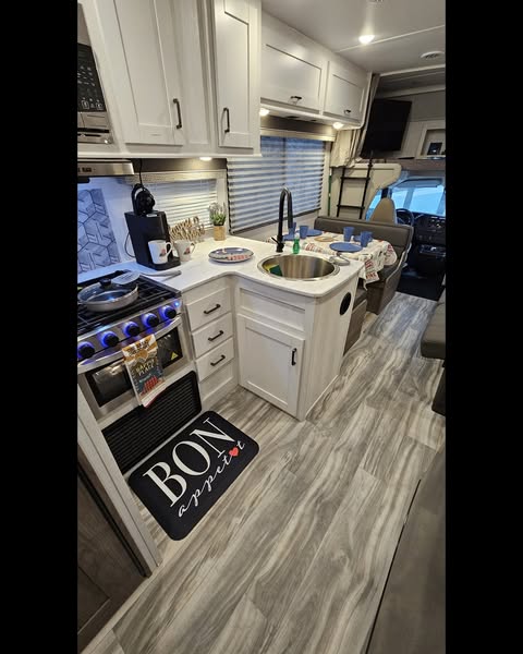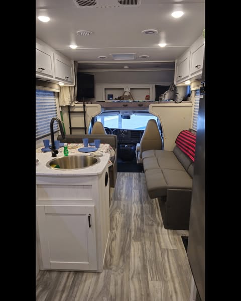 Stay fresh on the road with this thoughtfully designed bathroom featuring bright overhead lighting, a step-up toilet, and a sleek sink. Convenience and comfort wherever you travel!