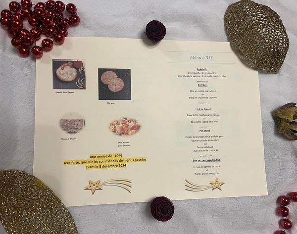 🎁 **Profitez d'une réduction exceptionnelle de 10 % sur nos menus de Noël** pour toute réservation passée avant le ** 8 décembre**.