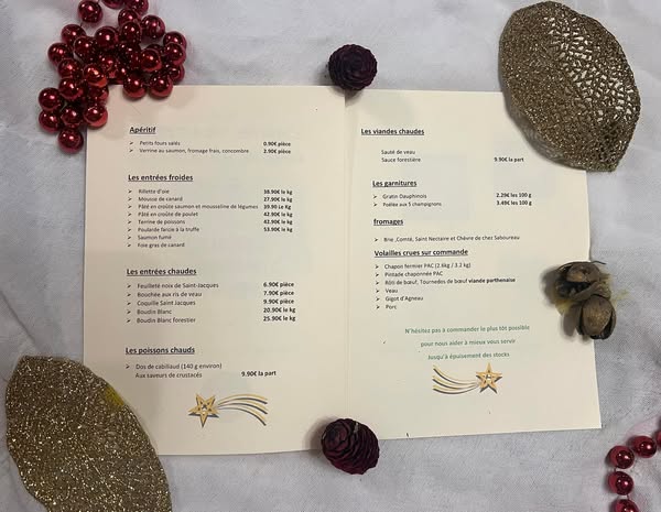 搜索关键词 Christmas menu, Butcher shop, festive meals, France Pamproux, Christmas discount, holiday dinner,Authentic flavors,Quality products, Christmas reservations, local butchery优势 High-quality products,Authentic flavors,Festive meal options,10% discount for early bookings