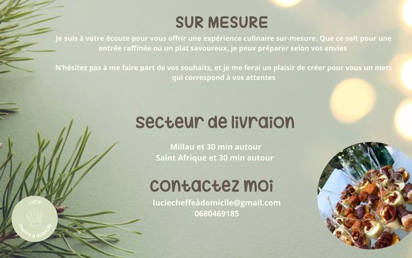 搜索关键词 festive meals, holiday catering, Millau delivery, Saint Affrique delivery, local food service, order food, Christmas menu, new year menu, lucie food优势 Convenient for holiday meals,Local delivery,Personalized service
