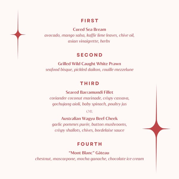 Indulge in dishes like Cured Sea Bream with mango salsa and kaffir lime leaves, Grilled Wild Caught White Prawn in a rich seafood bisque and the decadent Mont Blanc Gâteau with chestnut, mocha ganache and chocolate ice cream.