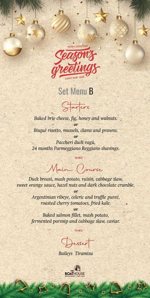 搜索关键词 Christmas dining, restaurant Christmas, Family Christmas, Boathouse Restaurant, Staff party menu, festive season dining, Christmas Eve dinner, New Year's Eve dinner, Restaurant private area, customized dining优势 Customized menus,Private area available,Festive season specialities