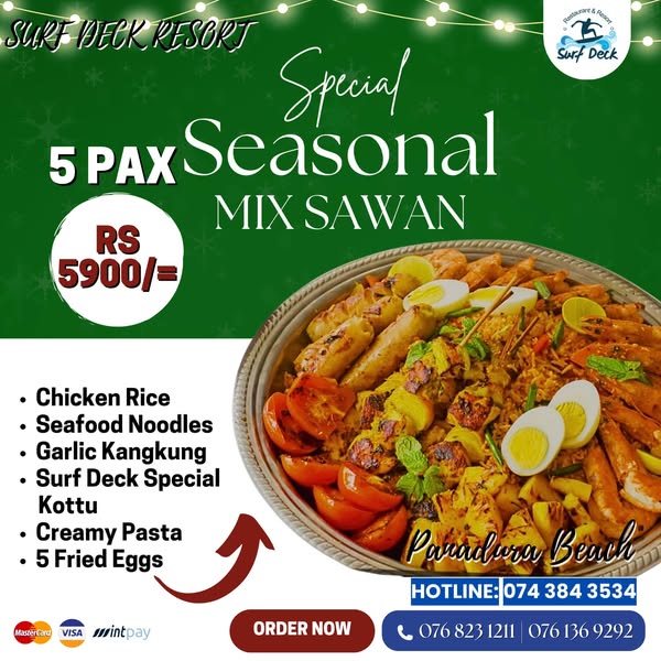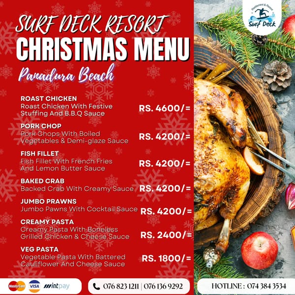 搜索关键词 surf deck resort, holiday season, beachfront dining, christmas menu, resort offers, panadura beach, kalutara resort, byob resort, beach vacation, festive dining优势 Festive Dining Experience,Beachfront Location,Variety of Offers (Group, Couple, Stay),BYOB,Accepts Mintpay and Credit Cards