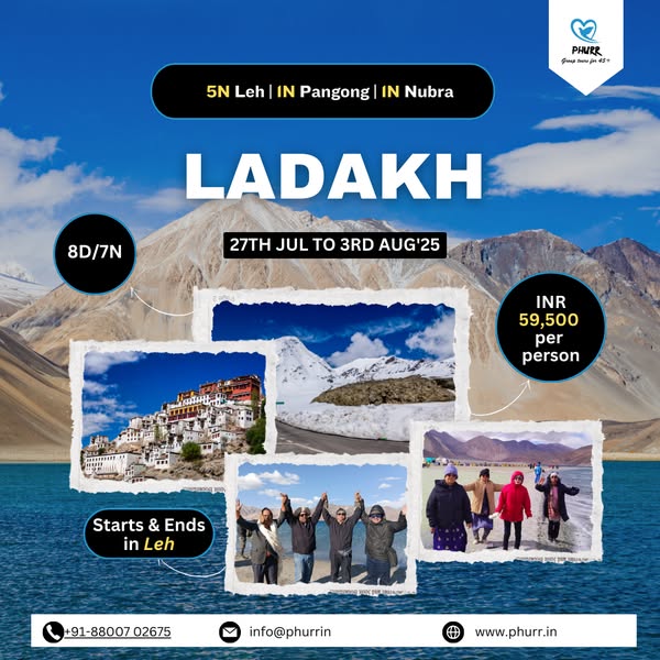Travel stress-free with a like-minded group, enjoying a leisurely paced itinerary and full assistance throughout. Whether for yourself or as a gift for your parents, we ensure a comfortable and memorable journey. Call/WhatsApp us at (+91) 9220583232 / 9711596164 or email info@phurr.in to initiate your booking today!