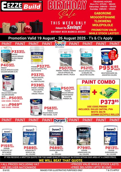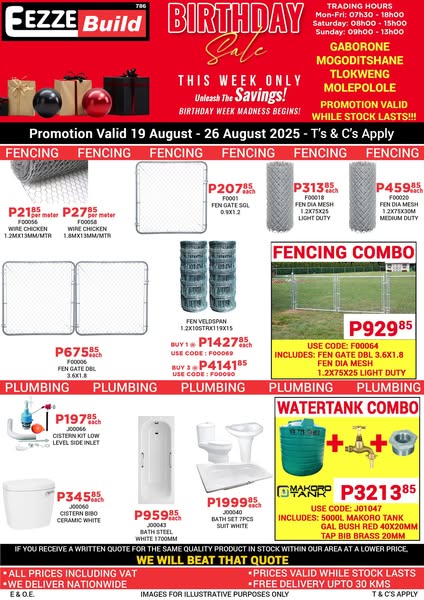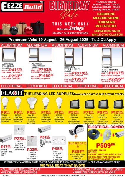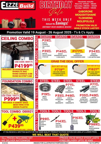 搜索关键词 building materials, hardware supplies, combo deals, construction supplies, Botswana retail, limited time offer, unbeatable prices, EEZZEBUILD birthday, Gaborone shopping, Tlokweng branch优势 Unbeatable combo prices,VAT Included,Limited-time offer