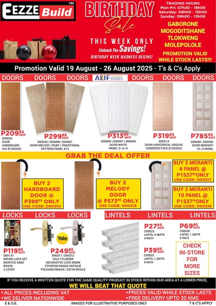 Fʀᴏᴍ **19ᴛʜ ᴛᴏ 26ᴛʜ Aᴜɢᴜsᴛ**, sʜᴏᴘ ᴀᴛ ᴏᴜʀ **Gᴀʙᴏʀᴏɴᴇ, Mᴏʟᴇᴘᴏʟᴏʟᴇ, Mᴏɢᴏᴅɪᴛsʜᴀɴᴇ, ᴀɴᴅ Tʟᴏᴋᴡᴇɴɢ ʙʀᴀɴᴄʜᴇs** ᴀɴᴅ ɢʀᴀʙ ʏᴏᴜʀ ʙᴜɪʟᴅɪɴɢ ᴍᴀᴛᴇʀɪᴀʟs & ʜᴀʀᴅᴡᴀʀᴇ ᴀᴛ **ᴜɴʙᴇᴀᴛᴀʙʟᴇ ᴄᴏᴍʙᴏ ᴘʀɪᴄᴇs – ALL VAT INCLUDED!** 🔨💰