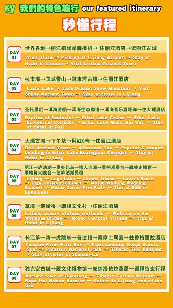 搜索关键词 Yunnan tour package, Dali Lijiang tour, Lugu Lake travel, Shangri-La adventure, China travel tours, Small group Yunnan tour, All inclusive China tour, Yunnan photography tour, Custom Yunnan itinerary, Yunnan private tour优势 Small group tours (2+ people),All-inclusive packages (transportation, accommodation, activities),No forced shopping or hidden costs,Professional photographer with drone footage,Customizable itineraries,English & Chinese speaking guides