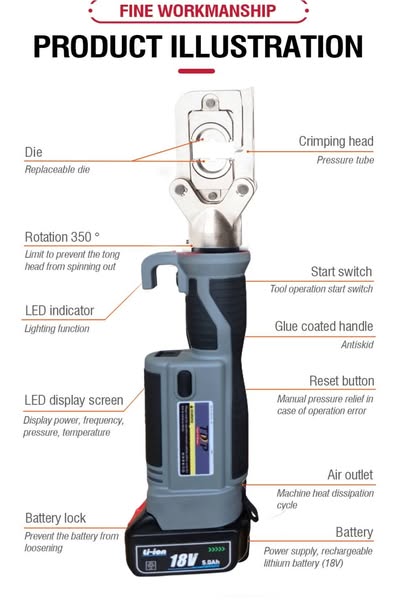 搜索关键词 automatic wire crimping, wire cutting tool, electrician tools, industrial tools, 2IN1 crimping tool, hydraulic crimper, power cable crimper, electrical engineering, crimping tools, thai technician优势 Fully Automatic System,Continuous Crimping,Easy and Fast Die Change,Strong and Durable,Neat Crimping Result,Suitable for Tight Spaces,Local Repair Service and Spare Parts Available
