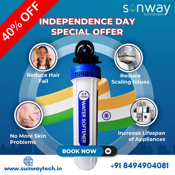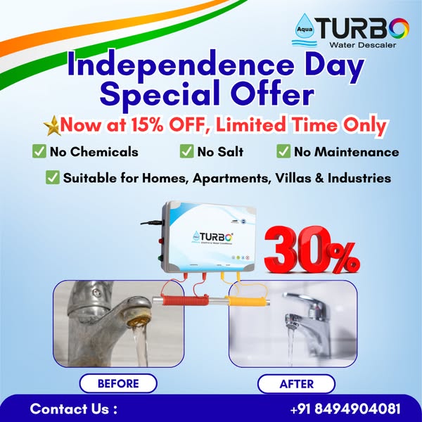 Say goodbye to hard water problems once and for all! This Independence Day, bring home the powerful Aqua Turbo Water Softener and enjoy flat 40% OFF – the biggest offer of the season. ✅ Removes hardness from water ✅ Protects skin, hair, appliances & plumbing ✅ Salt-free, chemical-free & eco-friendly ✅ Maintenance-free German technology Perfect for homes, apartments, villas & even industries! 📅 Hurry! Offer valid till August 15th, 2025 only. Limited stock – claim your offer now and experience soft water in every drop! ✍️ Description: 🎉 Independence Day Mega Offer! Get 40% OFF on Aqua Turbo Water Softener – no salt, no maintenance, pure convenience. Perfect for homes & industries facing hard water problems. 📞 Call: +91 8494904081 | 🌐