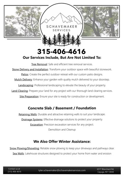 Schavemaker Services LLC is here to help you tackle all your property improvement needs this January! Whether it’s tree removal, trimming, or clean-up, we’ve got the equipment and expertise to get the job done right.