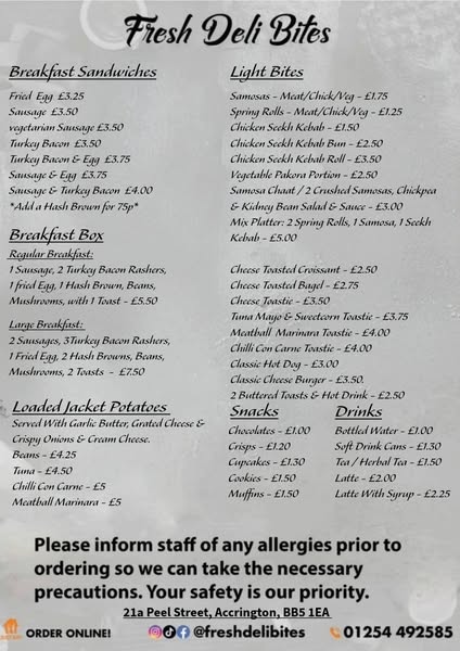 搜索关键词 Fresh Deli, Deli Bites, Breakfast Lunch, Hot Drinks, Food Delivery, Just Eat Delivery, In-Store Visit, Local Deli, Restaurant near me, Comfortable hot drink优势 Wide variety of food and drink options,Convenient opening hours,Multiple ordering options (in-store, delivery),Social media presence
