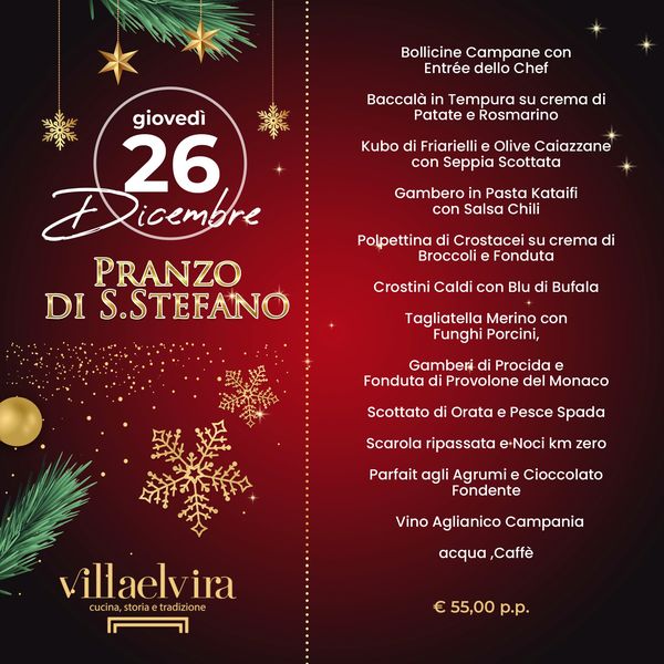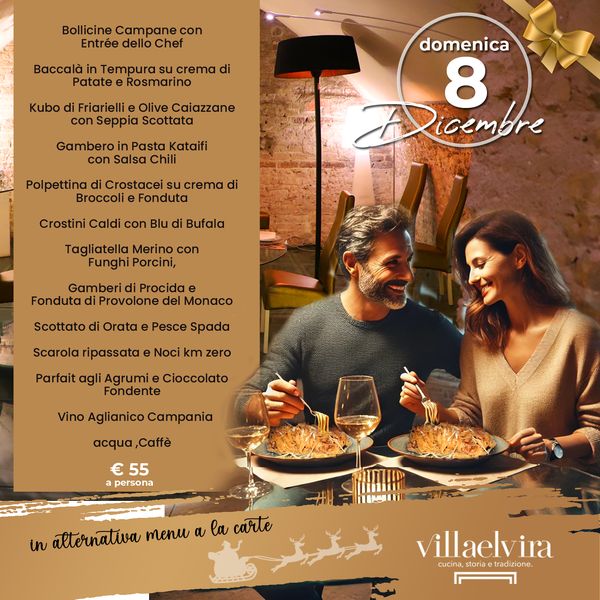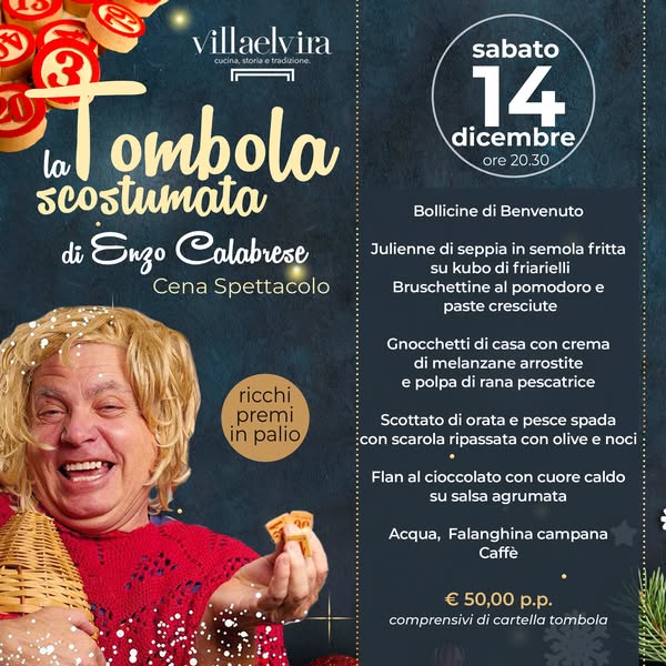 搜索关键词 Villa Elvira December, Pozzuoli Christmas, Italian festive dining, Tombola Scostumata, New Year's lunch, Christmas events Naples, Winter holiday Italy, Restaurant with entertainment, Festive menu, Holiday celebration Pozzuoli优势 Festive atmosphere,Variety of dining options (fixed menu or à la carte),Entertainment (Tombola Scostumata),Located in Pozzuoli, Italy