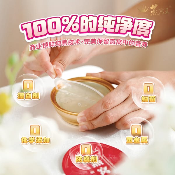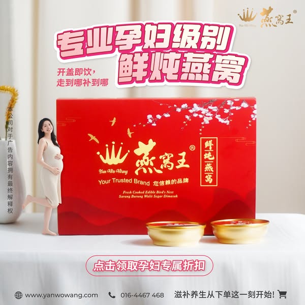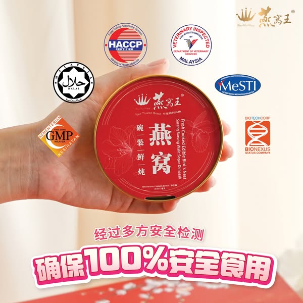 搜索关键词 pregnant women bird's nest, fresh stewed bird's nest, safe bird's nest, nutritional supplements for pregnancy, high quality bird's nest, bird's nest king, bird's nest safety certification, postpartum bird's nest, bird's nest nutrition, bird's nest Malaysia优势 专为孕妇设计,高品质原料(5A级燕盏),新鲜炖煮,保留营养,多重食品安全认证 (HACCP, MeSTI, GMP),无添加 (0化学添加、0防腐剂、0漂白剂、0重金属、0细菌),权威第三方检测报告,长条拉丝,肉眼可见