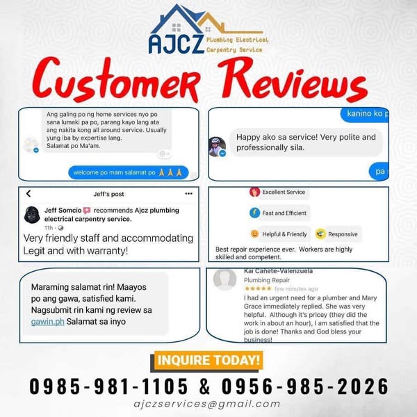 We take pleasure in introducing ourselves as Ajcz plumbing electrical carpentry service, capable of taking jobs on contract basis. Since we've been providing exceptional service for about 12 years, we've worked hard to always act fairly toward our clients. We're here to assist you in locating the necessary equipment and expertise to repair it. Ajcz offers services in Metro Manila and its surrounding areas.It was an honor for us to have you as a client. Your purchase is greatly appreciated.