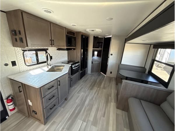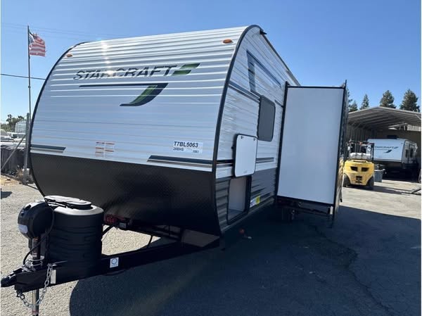This is absolutely the best value on a 2026 26BHS Bunkhouse loaded with a super slide, Solar Power, 80 gallons fresh water, 4500 lbs magnum truss roof, alloy wheels, exterior kitchen with grill, power front jack and so much more!
