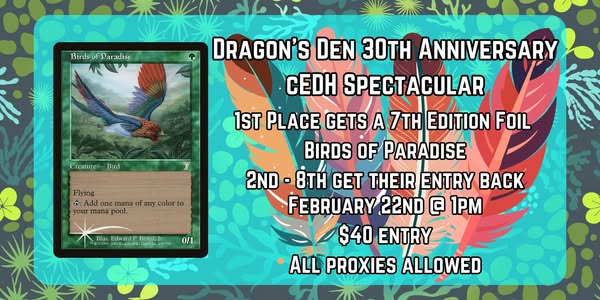 See you on Saturday, February 22nd at 1PM to compete for a LP 7th Edition Foil Birds of Paradise valued at $3000!! Entry is $40