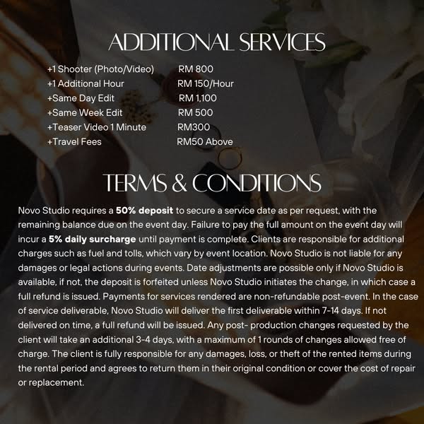 Celebrate your big day with our RM1000 all-in wedding package crafted with love for couples who value quality and simplicity. Choose either wedding photography or wedding videography service at an affordable flat rate