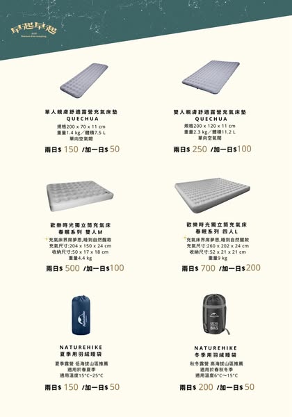 搜索关键词 早起露营租赁, 嘉义露营装备, 充气帐篷出租, 露营套餐服务, 露营装备嘉义, 懒人露营装备, 台湾露营租赁, buenosdiascp camping, Camping equipment rental, Chiayi Camping Gear优势 方便快捷的露营装备租赁,提供充气帐篷等懒人装备,菜單更新,提供多种套餐和新装备