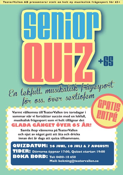 Under våren har vi haft SeniorQuiz uppe på TeaterVallen vilket blivit en omedelbar succé. Därför har vi lagt in tre torsdagar under sommaren där vi bjuder in det glada gänget över 65 år. Precis som i våras erbjuder vi ett fullmatad musikaliskt Quiz med fokus på låtarna från den tid det begav sig. Precis som under våren räknar vi med många gästande lag så missa inte att boka bord.
