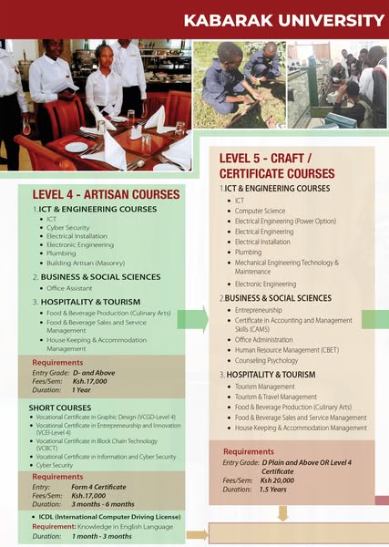 Looking for hands-on, industry-relevant training? Kabarak University TVET Institute offers Diploma, Certificate, and Professional Courses in Engineering, ICT, Business, Hospitality, and more! ✅ Affordable fees ✅ Flexible intakes in January, May, and September ✅ Accredited programs designed for career success!