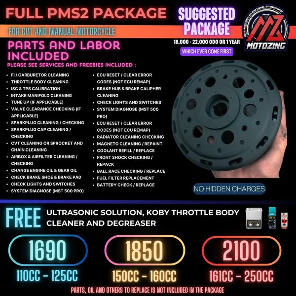 Solido at pinaka murang PMS at FULL PMS para sainyo! May bagong SERVICE DUO na sakto sa pangangailangan ng iyong motor. SIKSIK ang list of services na halos lahat andito na. NO HIDDEN CHARGES as in WALA kung ano ang nakalista yun ang gagawin at yun ang makukuha. Monitor at irecord natin ang Preventive Maintenance Schedule ng motor mo. Tuturuan ka pa namin maalagaan ang motor mo para iwas malaking gastos, kondisyon lagi ang motor, higit sa lahat safe ka.