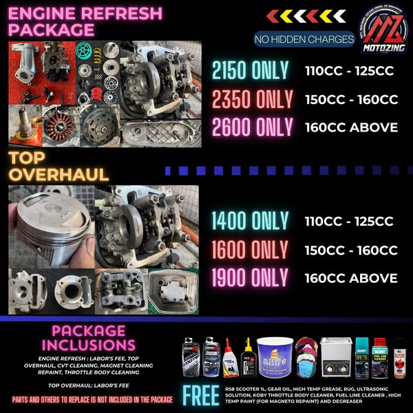 ‼️FREE! : Under Seat Compartment Cleaning (YES LIBRE LANG), High Temp Paint (for magneto repaint), Engine Oil, Gear Oil, Chain Lube, Koby Carbon Cleaner, Koby Throttle Body Cleaner, High Temp Grease, Ultrasonic Cleaner, Degreaser & Rug