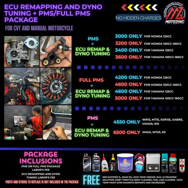搜索关键词 motorcycle maintenance, PMS package, ECU remapping, dyno tuning, motorcycle repair, Cavite Philippines, Motozing services, motorcycle cleaning, performance tuning, motorcycle accessories优势 Comprehensive service packages,Free cleaning solutions and underseat detailing,ECU remapping and dyno tuning,Transparent pricing with no hidden charges,Preventive maintenance schedule monitoring