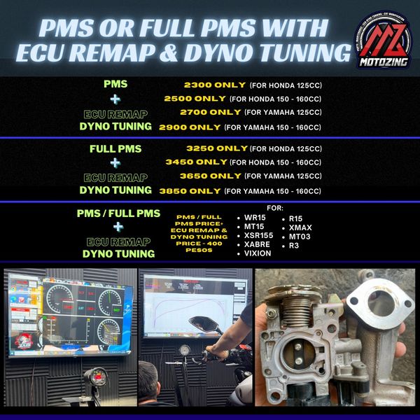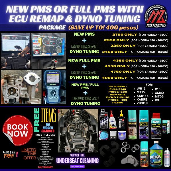 搜索关键词 motorcycle PMS, ECU remapping, dyno tuning, motorcycle service, motorcycle repair, performance tuning, free motorcycle parts, motorcycle maintenance package, cavite motorcycle shop, complete motorcycle service优势 Comprehensive service packages,Free parts and oil included,ECU remapping and dyno tuning available,No hidden charges
