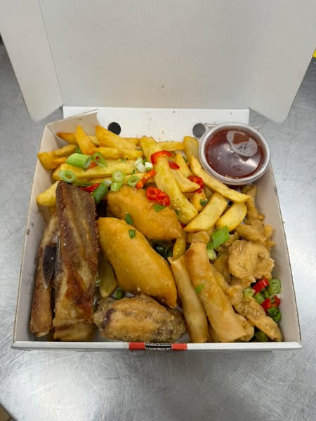 Pictured Small Salt, Pepper & Garlic Combination Box (Customer changed sauce to curry).