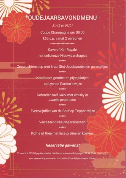 搜索关键词 Christmas menu, New Year's Eve dinner, Restaurant reservation, Festive dining, Fine dining experience, Belgium restaurant, Holiday season, Rijsttafel, A la carte, Special event优势 Festive atmosphere,Refined dishes,Special Christmas and New Year's Eve menus,Option to order à la carte on certain dates