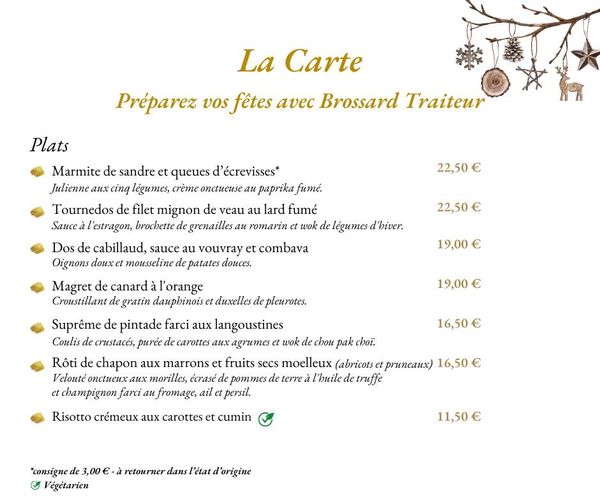 搜索关键词 menus fêtes, brossard traiteur, repas noel, new year dinner, christmas menu, french food, savonnières restaurant, halles tours, holiday catering, 2024 holiday menu优势 网上订购,本地食材,多种选择