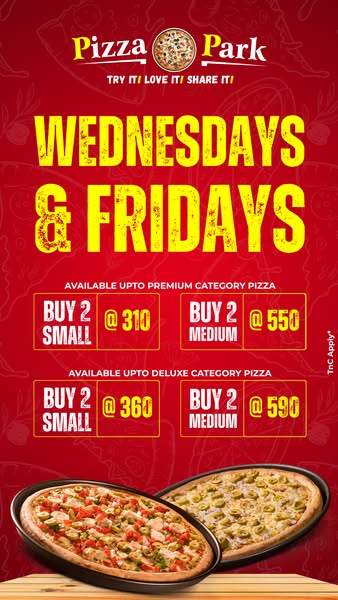 搜索关键词 Pizza deals, Wednesday pizza, Friday pizza, Pizza Park offers, Discount pizza, Premium pizza, Deluxe pizza, Cheap pizza, Indian pizza, pizza promotion优势 Affordable prices,Deals on premium and deluxe pizzas,Available on specific days